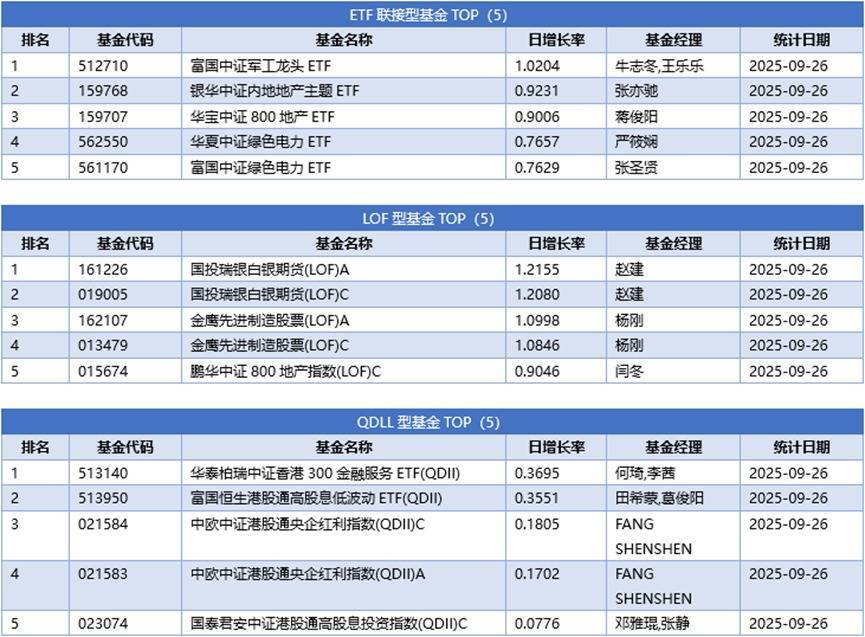 分投资类型看,同样剔除掉分级杠杆及固定收益两类基金的影响,股票型基金冠军为景顺长城上证科创板综合指数增强A,日增长率为3.0185%;债券型基金冠军为恒生前海恒裕债券A,日增长率为7.3431%;混合型基金冠军为前海开源研究优选混合A,日增长率为5.0576%;货币型基金冠军为银华交易型货币A(ETF),日增长率为0.0143%;ETF联接基金冠军为富国中证军工龙头ETF,日增长率为1.0204%;LOF型基金冠军为国投瑞银白银期货(LOF)A,日增长率为1.2155%;QDII基金冠军为华泰柏瑞中证香港300金融服务ETF(QDII),日增长率为0.3695%;下面是不同类型基金日增长率TOP5 (剔除掉分级基金的影响)