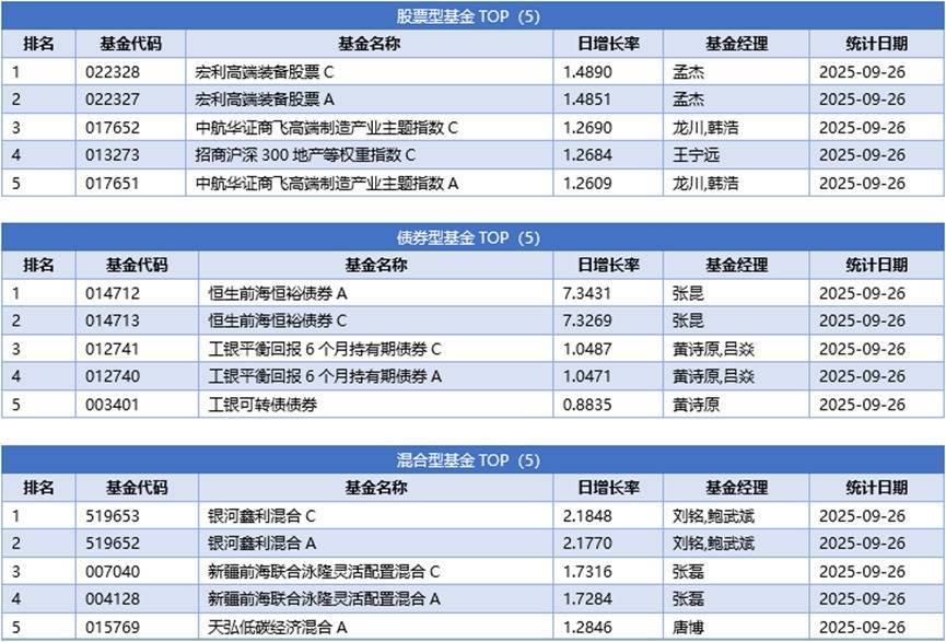 单基金方面,剔除掉 创新封基类型 基金的影响,09月26日业绩表现最好的基金为恒生前海恒裕债券A,日增长率为7.3431%,其次为恒生前海恒裕债券C,日增长率为7.3269%、前海开源研究优选混合A,日增长率为5.0576%。