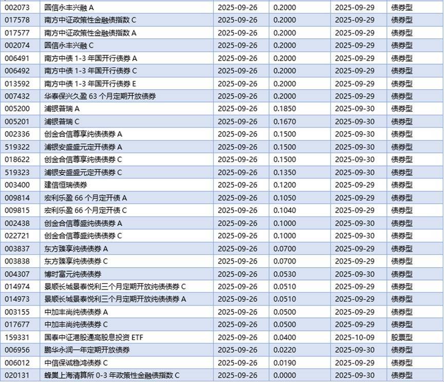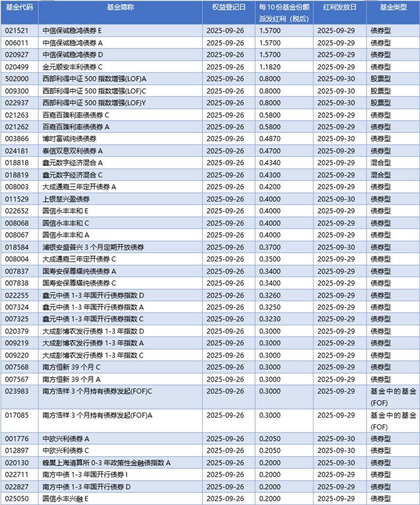 四、09月26日基金分红一览